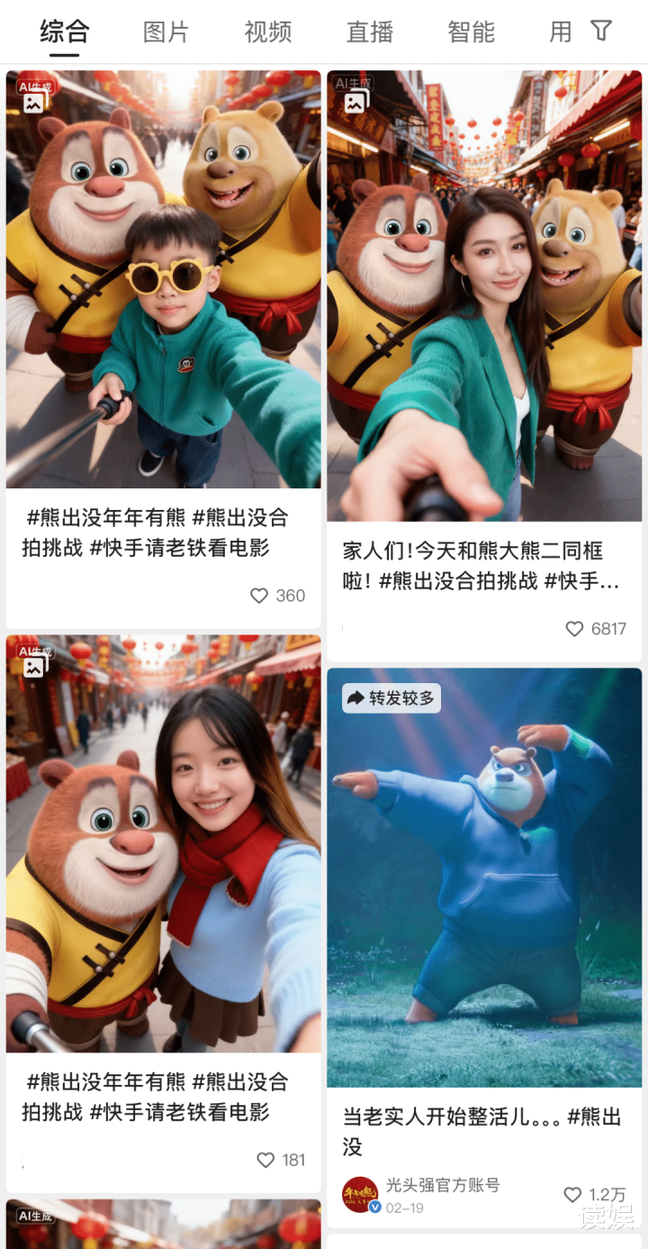 在电影宣发期间,《熊出没》与快手二次元、可灵AI联手打造了“熊出没新春盛典”直播,这场AI+IP的深度施行共创累计取得677万预约,直播总互动量超770万,关系话题登上181个快手热榜。这场盛典为影片票房热度提供了蹙迫推力。