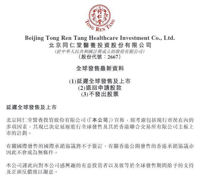 3月27日,行将贬抑招股并策划在3月30日上市的港股新股同仁堂医养倏得发布公告称,经讨论包括现行市况在内的多项身分,决定蔓延进行世界发售过头于香港团结交往扫数限公司主板上市的策划。