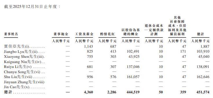高额股权激励径直推高了公司成本,2025年股份支付用度飙升至4.75亿元,同比增长21倍,占畴前行政开支近80%;同期,据招股书败露,2025年公司高管薪酬臆度达4.52亿元,其中吕江波、李睿宇、刘枢三位中枢经管东谈主员报答臆度冲破4亿元(含股份支付用度),占畴前净亏空的40%以上。在公司不息巨亏的配景下,这一“发红包”式激励的合感性遭到庸俗质疑。