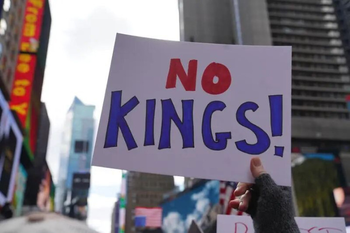 3月28日,在好意思国纽约滚球app(中国)官网下载,抗议者手举“不要国王”口号牌。新华社发