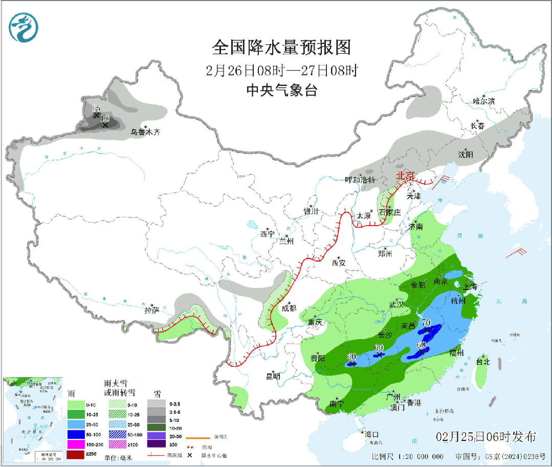 26日08时到27日08时,贵州东北部、湖南北部、广西西部和福建南部阴天有小雨局部中雨,贵州东南部、湖南中南部、江西大部、福建北部、广西东部阴天有中到大雨局部暴雨,其余步区多云间阴天。